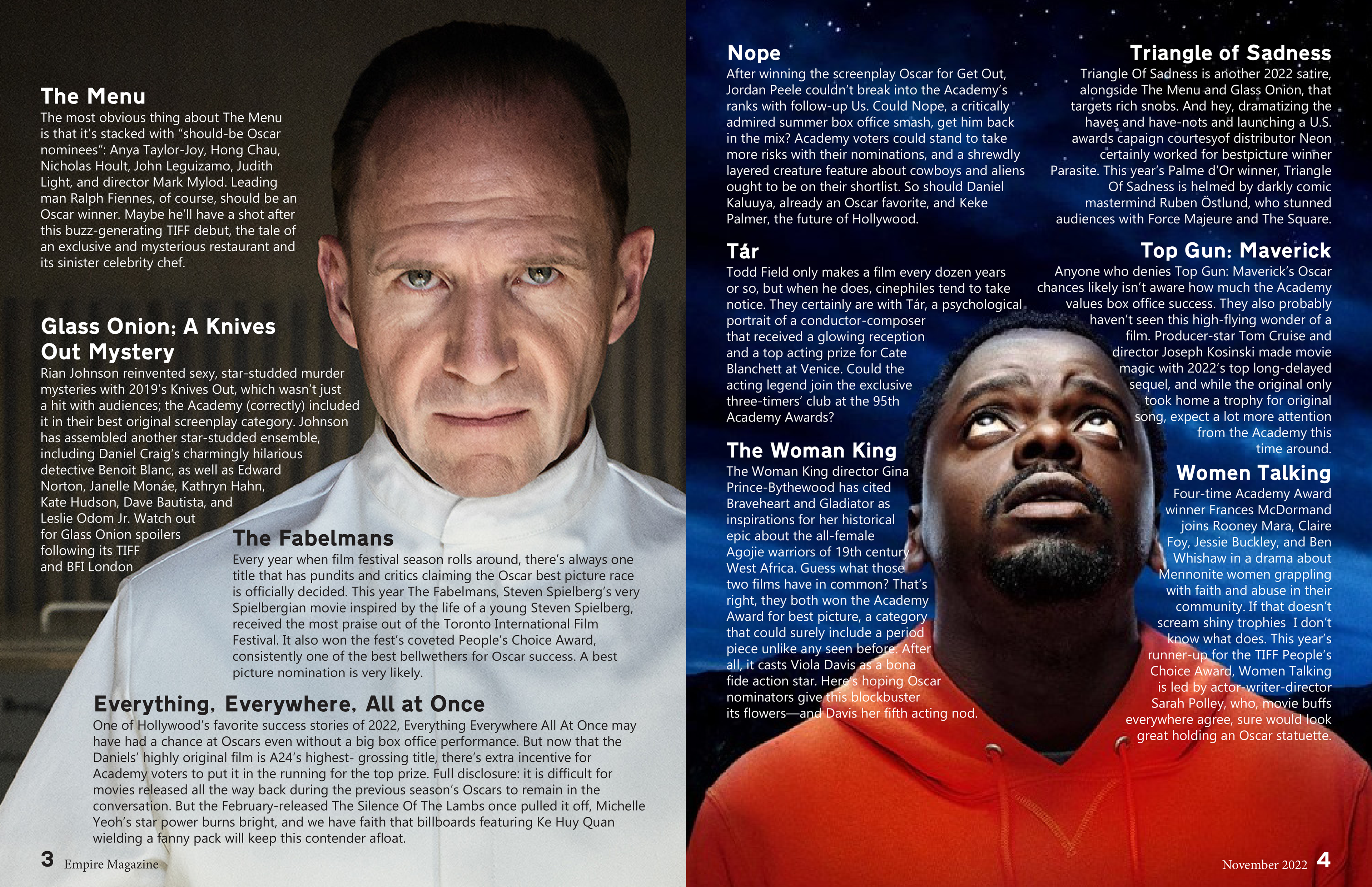 My love of film inspired me to put my own personal spin on a November 2022 edition "Empire" entertainment magazine. It features a series of fourteen briefs and two interview-based feature sections. Designed in Adobe InDesign.